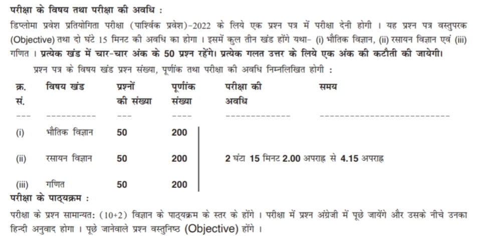 10+2 (व्यवसायिक / तकनीकी शिक्षा) अथवा 10वीं आई.टी.आई. (द्विवर्षीय पाठ्यक्रम) उत्तीर्ण आवेदकों को डिप्लोमा अभियंत्रण स्तर के सम्बन्धित पाठ्यक्रमों में प्रवेश हेतु चयन, डिप्लोमा प्रवेश प्रतियोगिता परीक्षा [पाश्विक प्रवेश]-2022 [Diploma Entrance Competitive Examination (Lateral Entry )-2022] के परीक्षाफल से तैयार की गई मेधा सूची से योग्यता-सह-विकल्प के आधार पर होगा जिसका संचालन बिहार सरकार द्वारा गठित बिहार संयुक्त प्रवेश प्रतियोगिता परीक्षा पर्षद करेगा।