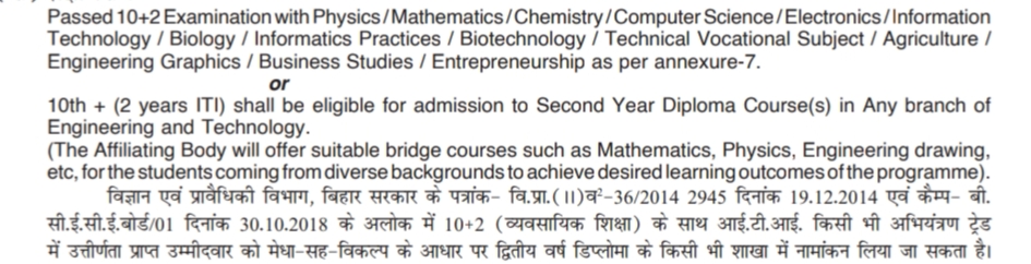 10+2 (व्यवसायिक / तकनीकी शिक्षा) अथवा 10वीं + आई.टी.आई. (द्विवर्षीय पाठ्यक्रम) उत्तीर्ण छात्रों का त्रिवर्षीय डिप्लोमा अभियंत्रण पाठ्यक्रम के द्वितीय वर्ष में नामांकन हेतु |