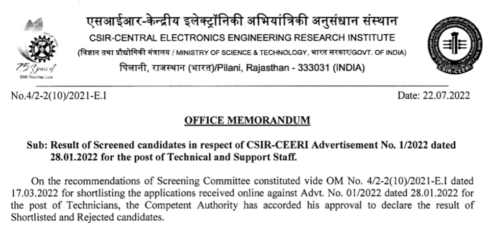 CSIR CEERI ITI Technician Shortlisted/Rejected Candidates PDF List 2022