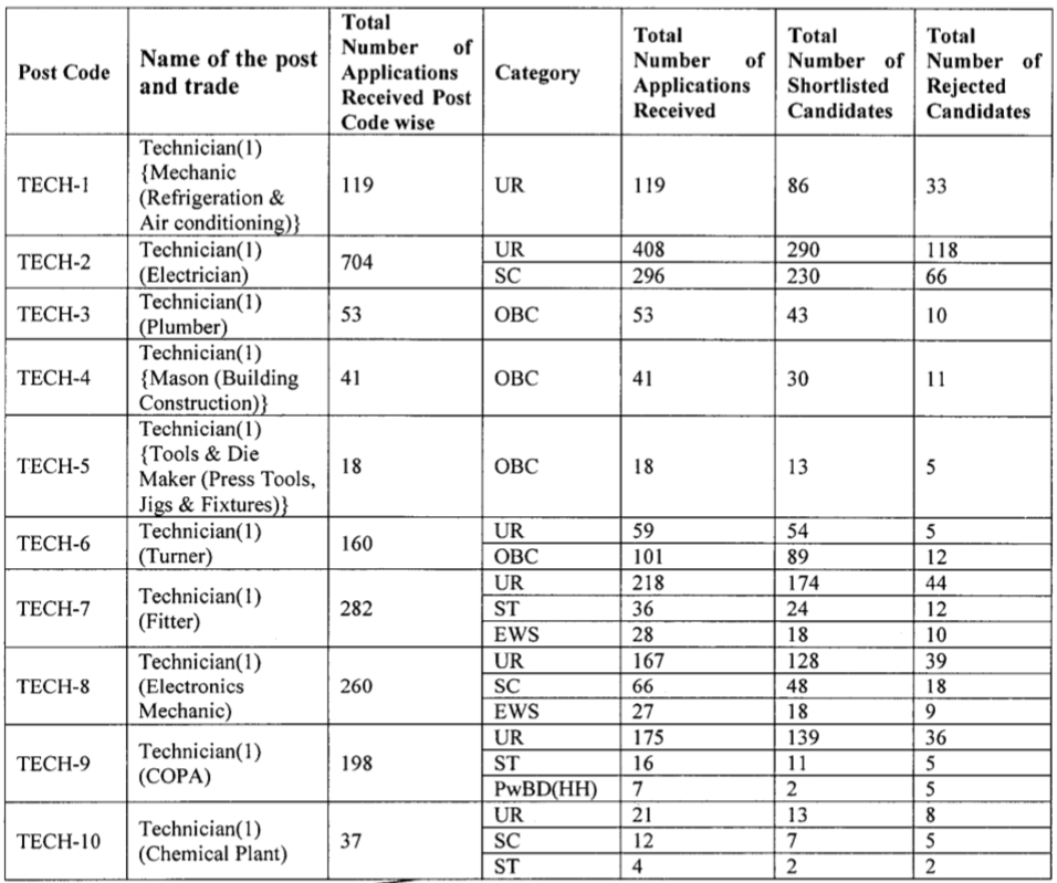 Summary of Applications for the post of Technician