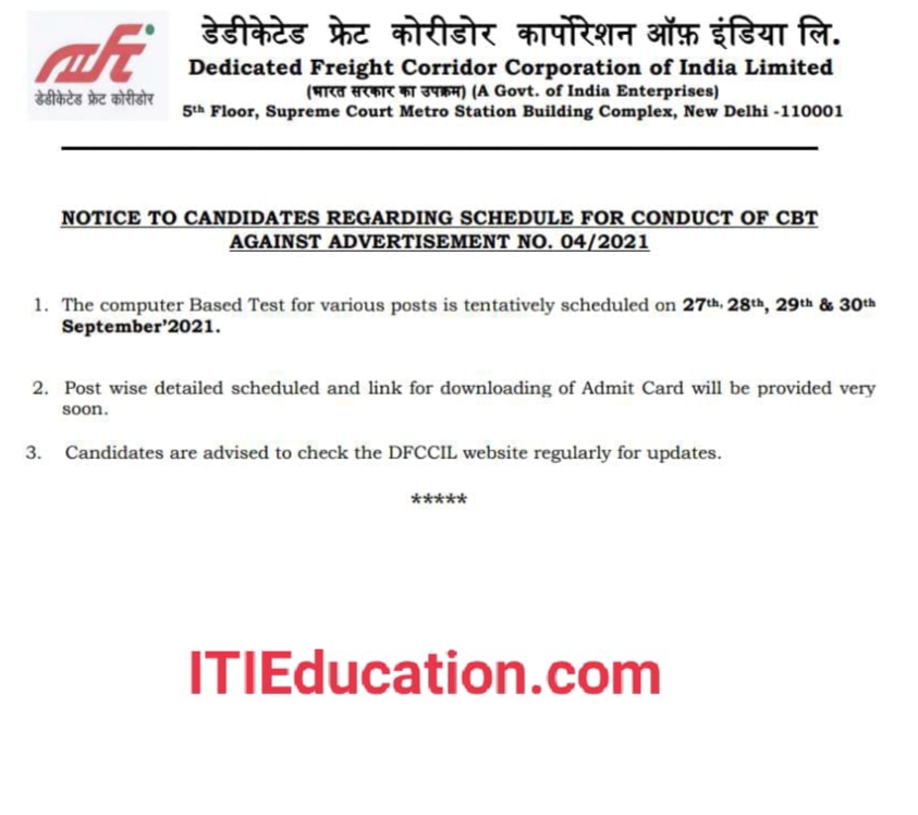 DFCCIL CBT Exam Date 2021- DFCCIL की तरफ से दसवीं, आईटीआई और डिप्लोमा वालो के लिए 1074 पदों के लिए अप्रैल 2021 में बहाली आया था | DFCCIL की तरफ से CBT Exam Date जारी कर दिया गया है | जो भी विद्यार्थियो ने फार्म भरें आप सभी तैयारी शुरु कर दीजिए | नीचे दिए गए नोटिस को डाउनलोड कर के देख लीजिए आप सभी | DFCCIL की तरफ सीबीटी ऑनलाइन परीक्षा का तिथि 27,28,29 और 30 सितंबर को रखा गया है | अभी एडमिट कार्ड जारी नही किया गया है लेकिन जल्द ही एडमिट कार्ड जारी कर दिया जाएगा | जब भी एडमिट कार्ड आएगा तो सबसे पहले मेरे वेबसाइट पे सुचना दे दिया जाएगा |