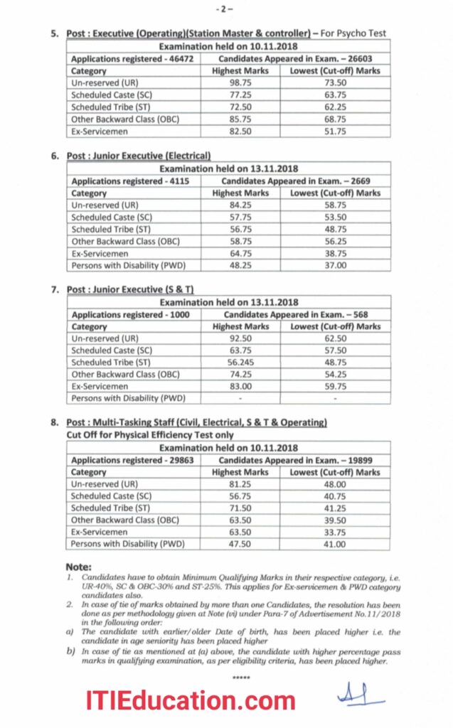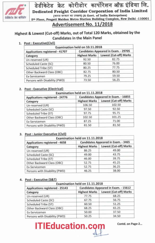 DFCCIL Cutoff Marks 2018- DFCCIL की तरफ आईटीआई विद्यार्थियों के लिए Junior Executive के पद पर कुल 349 पोस्ट के लिए वैकेंसी October 2018 में आया था | जिसमें Junior Executive ( Civil- 239 Post, Electrical- 68 Post, Signal & Telecommunication- 42 Post ) के लिए बहाली आया था | कटऑफ मार्क्स बताने से पहले मैं आप सभी को Exam Pattern के बारे में बता देता हूं | Junior Executive Post के लिए 2 घंटे का ऑनलाइन परीक्षा होता हैं जिसमे कुल 120 Question आया था | 60 Question Technical और 60 Question Non Technical से आया था | सही उत्तर के लिए 1 मार्क्स और गलत उत्तर के 0.25 मार्क्स का प्रावधान है | नीचे दिए गए नोटिस डाउनलोड कर के अपने ट्रेड के अनुसार कटऑफ देख लीजिए |