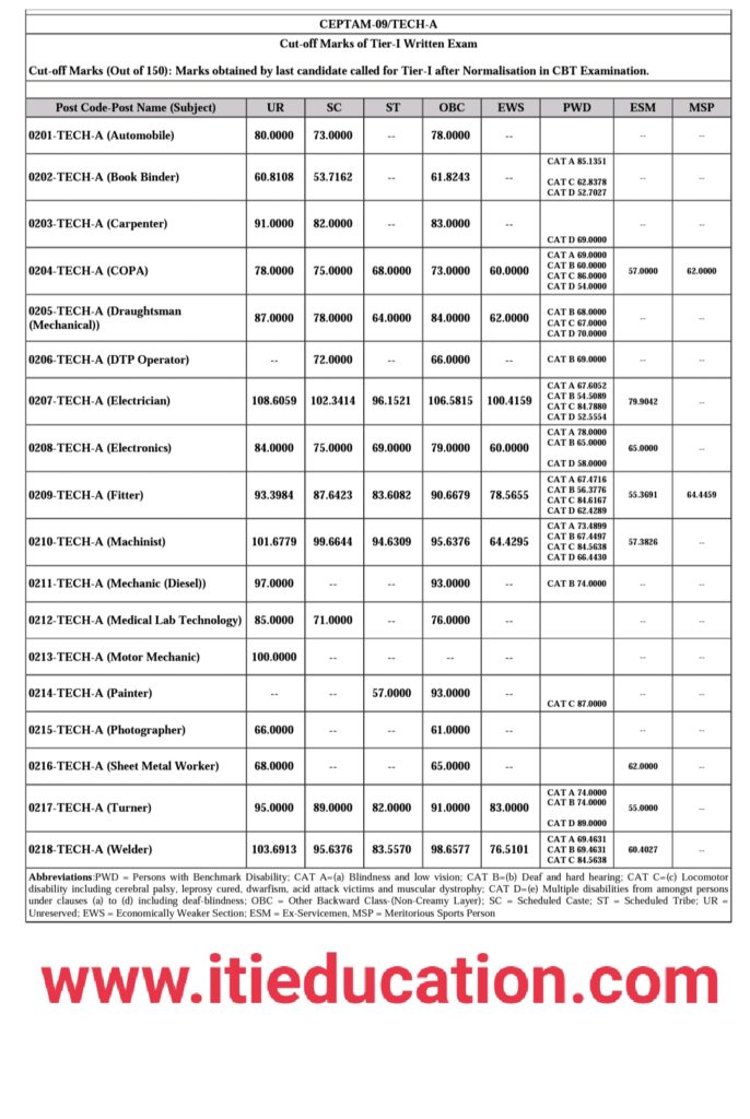 DRDO ITI Technician A Cutoff Marks 2019- DRDO की तरफ अंतिम बार आईटीआई विद्यार्थियों के लिए वैकेंसी जून माह 2019 वर्ष में आया था | जिसमें कुल पोस्ट 351 था एवं पोस्ट का नाम टेक्नीशियन ए था | ट्रेड के अनुसार इस तरह पोस्ट था Automobile- 03 Post, Book Binder- 11 Post, Carpenter- 04 Post, COPA- 55 Post, Draughtsman Mechanical- 20 Post, DTP Operator- 02 Post, Electrician- 49 Post, Electronics- 37 Post, Fitter- 59 Post, Machinist- 44 Post, Diesel Mechanic- 07 Post, Medical Lab Technology- 04 Post, Motor Mechanic- 02 Post, Painter- 02 Post, Photographer- 07 Post, Sheet Metal Worker- 07 Post, Turner- 24 Post, Welder- 14 Post | आज मैं आपलोग को बताऊंगा की डीआरडीओ का कटऑफ कितना गया था | कटऑफ जानने से पहले आपलोग एग्जाम पैटर्न के बारे में जान लीजिए |