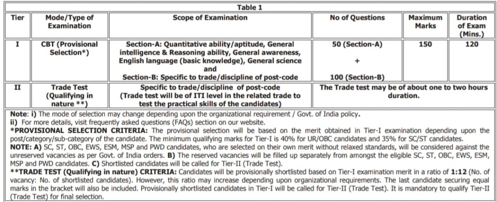 Selection Process & Process- Technician A पद के लिए दो Exam देना होता है Tier 1 (CBT) और Tier 2 (Trade Test) | जो स्टूडेंट Tier 1 में पास होंगे उन्हें ही Tier 2 के लिए बुलाया जाएगा | Tier 2 (Trade Test) में 12 गुणा अधिक स्टूडेंट को बुलाया जाता हैं | मेरिट लिस्ट सिर्फ Tier 1 पर बनता हैं | Tier 2 में सिर्फ पास करना रहता हैं | Tier 1 में 50 प्रश्न नॉन टैक्निकल से और 100 प्रश्न टेक्निकल से पूछा जाता है | Tier 1 में 50 प्रश्न गणित, विज्ञान, रीजनिंग, सामान्य इंग्लिश, और करेंट अफेयर्स से आता हैं एवं 100 प्रश्न टेक्निकल जिस ट्रेड से फॉर्म भरेंगे उसी ट्रेड से आएगा | टोटल 150 नंबर का एग्जाम होता है जिसके लिए 2 घंटे का समय मिलता है | अपलोगो के लिए नीचे में ऑफिशियल इमेज लगा दे रहा हूं आप सभी डाउनलोड कर लीजिए |