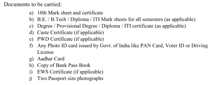 - Candidates willing to join are requested to bring a signed printout of the application along with the originals and one Xerox copy of Each document mentioned below.