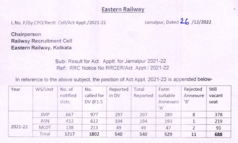 Eastern Railway Apprentice Jamalpur Asansol Malda Final Joining Merit List 2022- Railway Recruitment Cell (RRC) Eastern Railway Kolkata की तरफ से आईटीआई पास विद्यार्थियों के लिए अप्रेंटिस की वैकेंसी निकाली गई थी | जिसका फॉर्म बहुत सारे आईटीआई विद्यार्थियों के भरे थे |