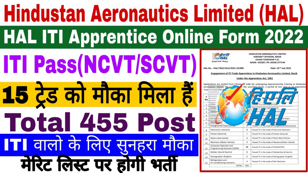 HAL Nasik Apprentice Form 2022- 455 Post, Eligibility, Stipend, Selection Process and Full Notification- Hindustan Aeronautics Limited (HAL) Nasik Division Are Invited Online Application Form for the Post of ITI Trade Apprentice. Those Candidates Are Interested to the Following Recruitment Can Read the Full Notification Before Apply Online Form.