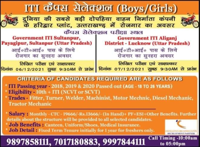 Hero Motocorp Limited Campus Placement For ITI Students (Boys/Girls)