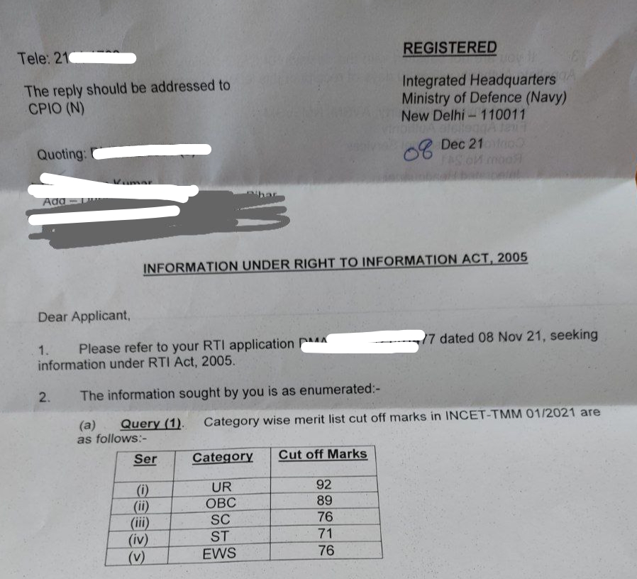 Indian Navy Tradesman Mate Cutoff 2021- Indian Navy की तरफ से आईटीआई विद्यार्थियों के लिए कुल 1159 पदों पर ट्रेड्समैन मेट की वेकेंसी फरवरी 2021 में आया था | ट्रेड्समैन मेट का ऑनलाइन सीबीटी परीक्षा 20-22 मार्च 2021 और 27 जुलाई 2021 को आयोजित कराया गया | Indian Navy की तरफ से ट्रेड्समैन मेट का रिजल्ट 8 नवंबर 2021 को जारी किया गया | आज मैं आप सभी को ट्रेड्समैन मेट का कटऑफ के बारे में बताऊंगा | ट्रेड्समैन मेट का ऑफिशियल कटऑफ के लिए इंडियन नेवी को आरटीआई आवेदन किया गया उसके बाद इंडियन नेवी की तरफ से आरटीआई का जवाब मिला |