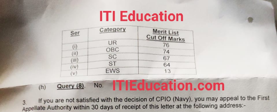 Indian Navy Tradesman Mate Cutoff Marks 2019- Indian Navy की तरफ से आईटीआई विद्यार्थियो के लिए कुल 554 पदों के लिए ट्रेड्समैन मेट का बहाली आया था | ट्रेड्समैन मेट का कटऑफ के जानकारी के लिए मेने आरटीआई आवेदन किया था | जिसके बाद इंडियन नेवी ने इस प्रकार जानकारी दी है | नीचे में मैं नोटिस लगा दूंगा आपलोग डाउनलोड करके देख सकते हैं |