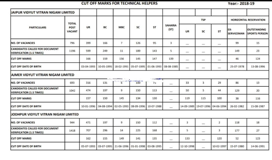 सबसे ज्यादा कटऑफ Jodhpur Vidyut Vitran Nigam Limited में गया था | फिर उसके बाद Jaipur Vidyut Vitran Nigam Limited में गया था | सबसे कम कटऑफ Ajmer Vidyut Vitran Nigam Limited में गया था | आप सभी ऊपर दिए गए फोटो को डाउनलोड करके कटऑफ देख सकतें हैं | Jaipur Vidyut Vitran Nigam Limited में Technical Helper की कुल सीट 796 थी | Ajmer Vidyut Vitran Nigam Limited में Technical Helper की कुल सीट 693 थी | Jodhpur Vidyut Vitran Nigam Limited में Technical Helper की कुल सीट 944 थी |