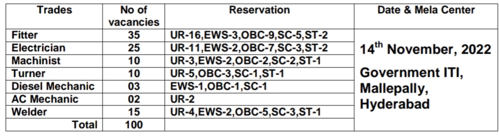 Company requires 100 ITI Trade Apprentices for one year apprenticeship training under the Apprenticeship Act, 1961 in the following trades: