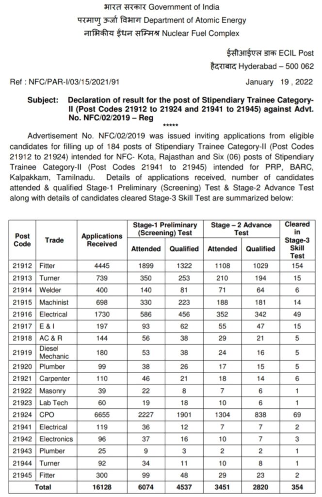 Advertisement No. NFC/02/2019 was issued inviting applications from eligible candidates for filling up of 184 posts of Stipendiary Trainee Category-II (Post Codes 21912 to 21924) intended for NFC- Kota, Rajasthan and Six (06) posts of Stipendiary Trainee Category-II (Post Codes 21941 to 21945) intended for PRP, BARC, Kalpakkam, Tamilnadu. Details of applications received, number of candidates attended & qualified Stage-1 Preliminary (Screening) Test & Stage-2 Advance Test along with details of candidates cleared Stage-3 Skill Test are summarized below: