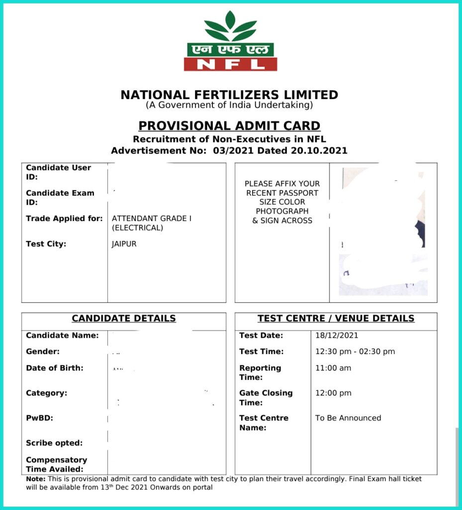 NFL Admit Card 2021- National Fertilizers Limited की तरफ से आईटीआई विद्यार्थियों के लिए कुल 36 पदों पर अक्टूबर माह 2021 में वैकेंसी निकाली गई थी | जिसमें इलेक्ट्रिशियन के लिए 19 पद, फिटर के लिए 17 पद था | Finally NFL की तरफ Provisional Admit Card जारी कर दिया गया है | आप सभी नीचे दिए गए लिंक से एडमिट कार्ड डाउनलोड कर सकते हैं |