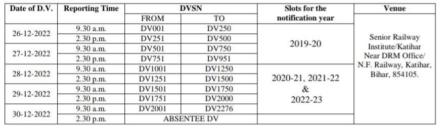 NFR Katihar Division Apprentice DV Date & Venue 2022
