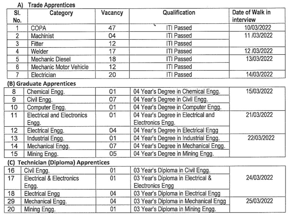 Eligibility Criteria: The candidates who have undergone/ undergoing already registered for Apprenticeship Training elsewhere under Apprenticeship Act 1961 will not be eligible for candidature. Candidates who have not completed Three Years (3-Years) (Calculated from the Date of Passing mentioned in the Provisional Degree/Diploma/ITI Certificate or Degree/Diploma /ITI Certificate to the date of engagement as an Apprentice Trainee) after qualifying examination, having Minimum Age 18 years and Maximum Age 30 years as on 31.03.2022 is eligible for undergoing the Apprenticeship Training. Relaxation on maximum Age for reserved category will be as per the applicable Rules. SC/ST/OBC candidates will be selected as per the quota fixed by the Government under the Apprentices Act, 1961.