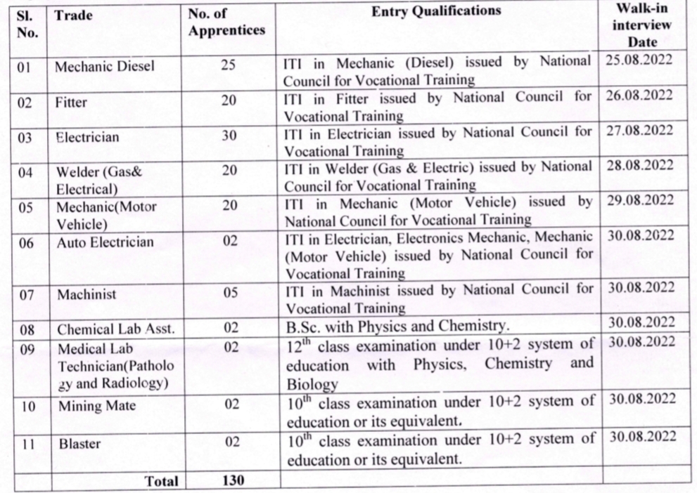 M/s. NMDC Limited BIOM, Bacheli Complex is conducting walk-in interview for Trade Apprentices under Apprenticeship Act-1961, Eligible candidate having the requisite qualification as mentioned against the respective category may attend walk-in interview on the dates mentioned against each category.
