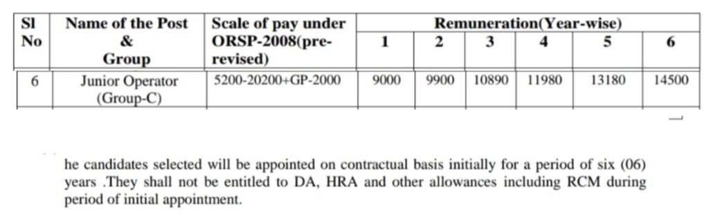 The appointment of Junior Operator Post will be initially on contractual basis for a period of six (06) years carrying a consolidated pay indicated as below in the pre revised scale under ORSP Rules-2008.
