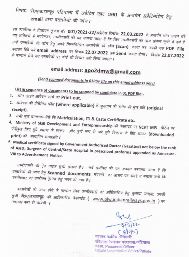Patiala Locomotive Works Apprentice Form 2022 Overview