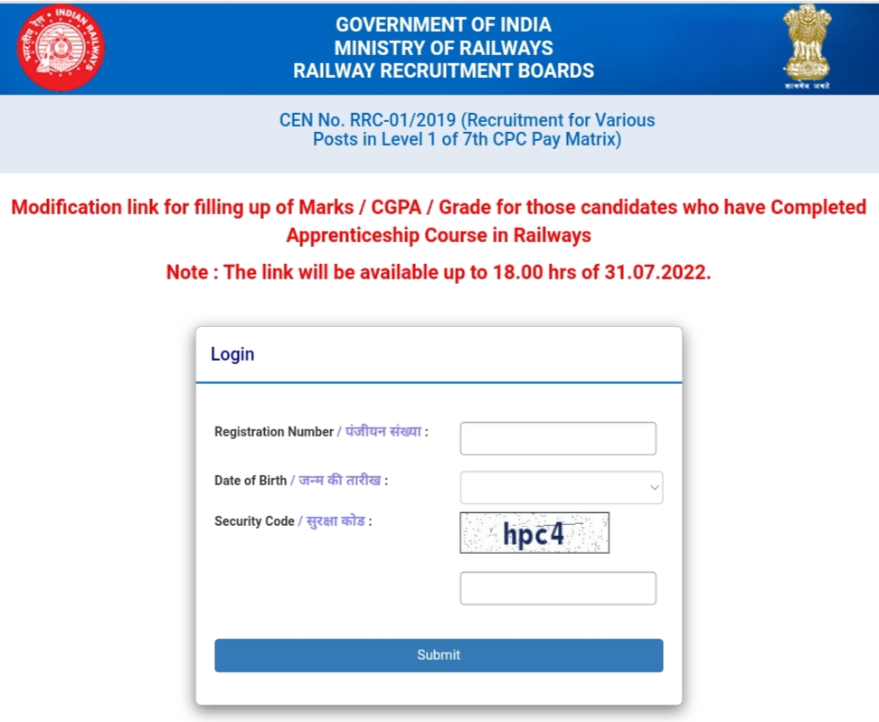 Course Completed Act Apprentices (CCAAs) trained in Railways candidates should upload their details of marks pertaining to NCVT examination through the link provided in the official website of respective RRBs. This link is for those CCAAs who had completed their Apprenticeship (In Railway Establishment) on or before last date for registration of online application for this CEN i.e. on or before 12.04.2019 (Cutoff date for completion of Apprenticeship) and filled up the required details in the submitted online application.