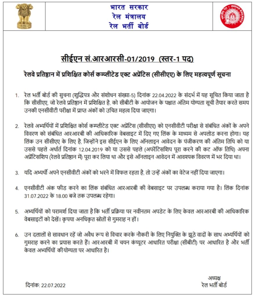 In reference to Railway Recruitment Boards notice (Corrigendum & Amendment no.-5) dated 22.04.2022, it is to inform that CCAAs trained in Railway Establishment shall be given due weightage of marks obtained in their NCVT examination in preparation of final merit list after conduct of CBT.