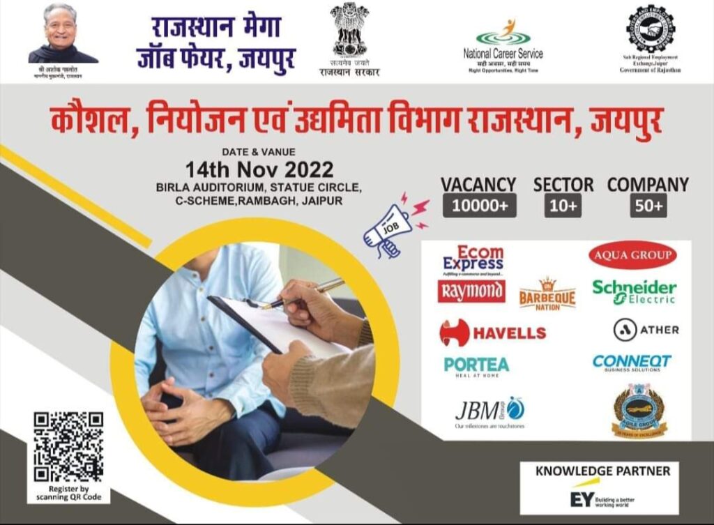 Rajasthan Job Fair 2022- आप सभी के लिए अच्छी खबर निकल कर आ रही हैं | श्रम एवं रोजगार विभाग की वार्षिक कार्ययोजना वर्ष 2022-23 के अंतर्गत रोजगार सेवा निदेशालय, राजस्थान, जयपुर के द्वारा एक दिवसीय राजस्थान मेगा जॉब फेयर का आयोजन हो रहा है जो दिनांक 14-11-2022 सोमवार को BIRLA AUDITORIUM, STATUE CIRCLE, JAIPUR जयपुर में किया जा रहा है |