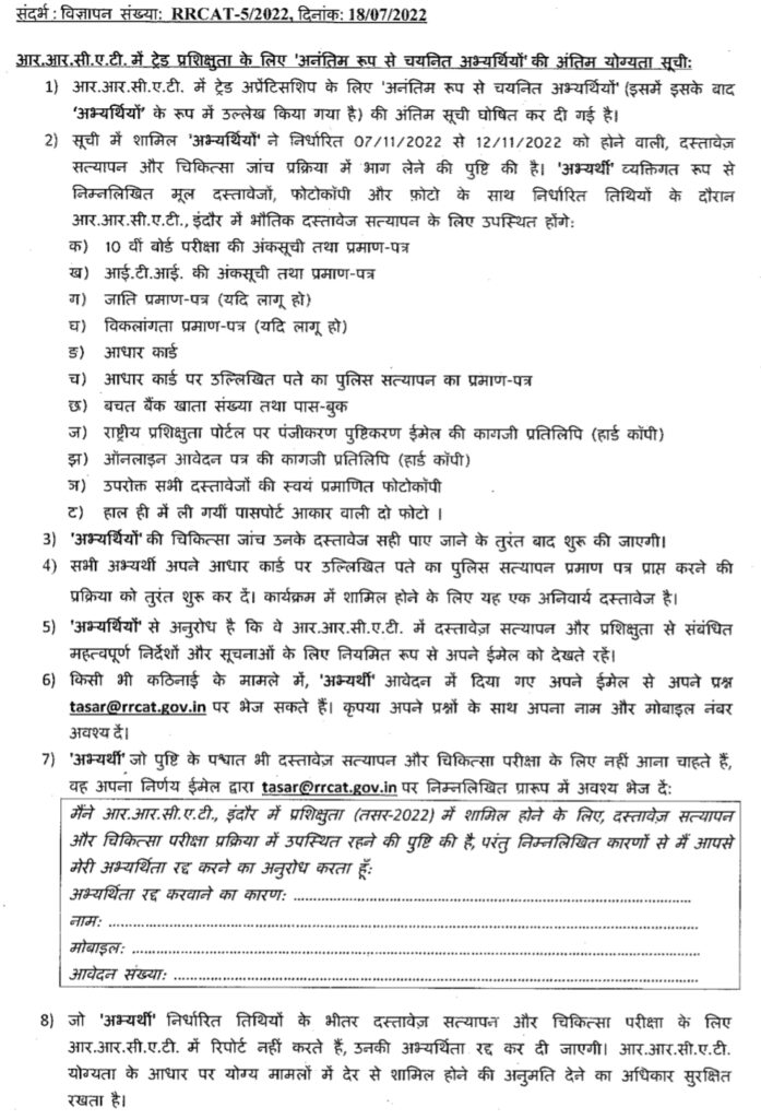 RRCAT Apprentice Joining Merit List 2022 Important Notice