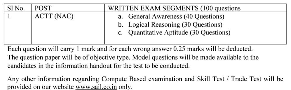 Eligible candidates for the above posts will be required to appear in Computer Based examination (which may be Computer Based). The minimum qualifying marks in Computer Based examination will be determined based on 50 percentile score (for UR Category) and 40 percentile score (for SC/ ST/ OBC (NCL) & PWD candidates. Candidates who qualify in the Compute Based examination will be called for Skill Test / Trade Test in the ratio of 1:3. Skill Test / Trade Test will be only qualifying in nature and the final merit list of candidates who qualify the Skill Test / Trade Test will be prepared on the basis of marks obtained in the Compute Based examination only.