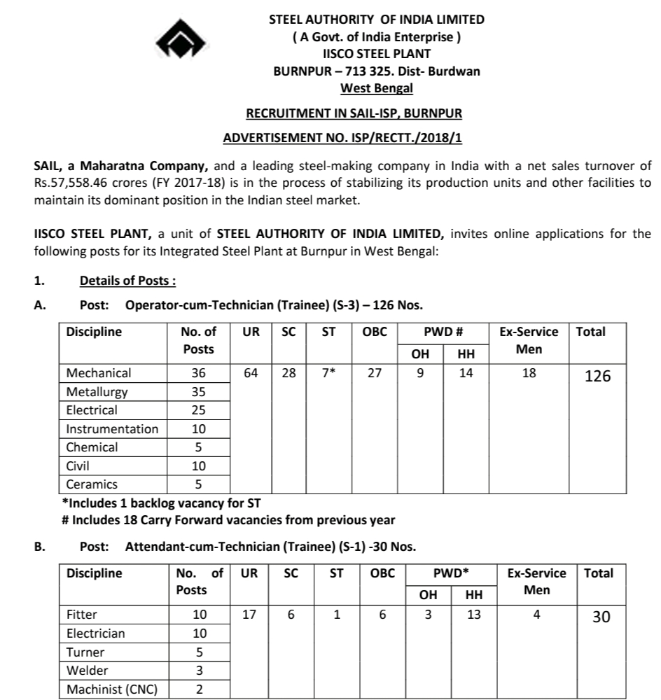 SAIL IISCO Steel Plant ACTT Result Download