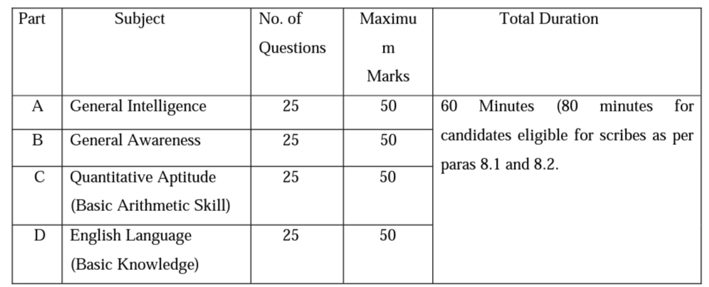 There will be three separate Computer Based Examinations consisting of Objective Type Multiple Choice questions, for the posts with minimum Educational Qualification of Matriculation, Higher Secondary, and Graduation & above levels. The details of subjects, marks and number of questions subject-wise will be as given below:-