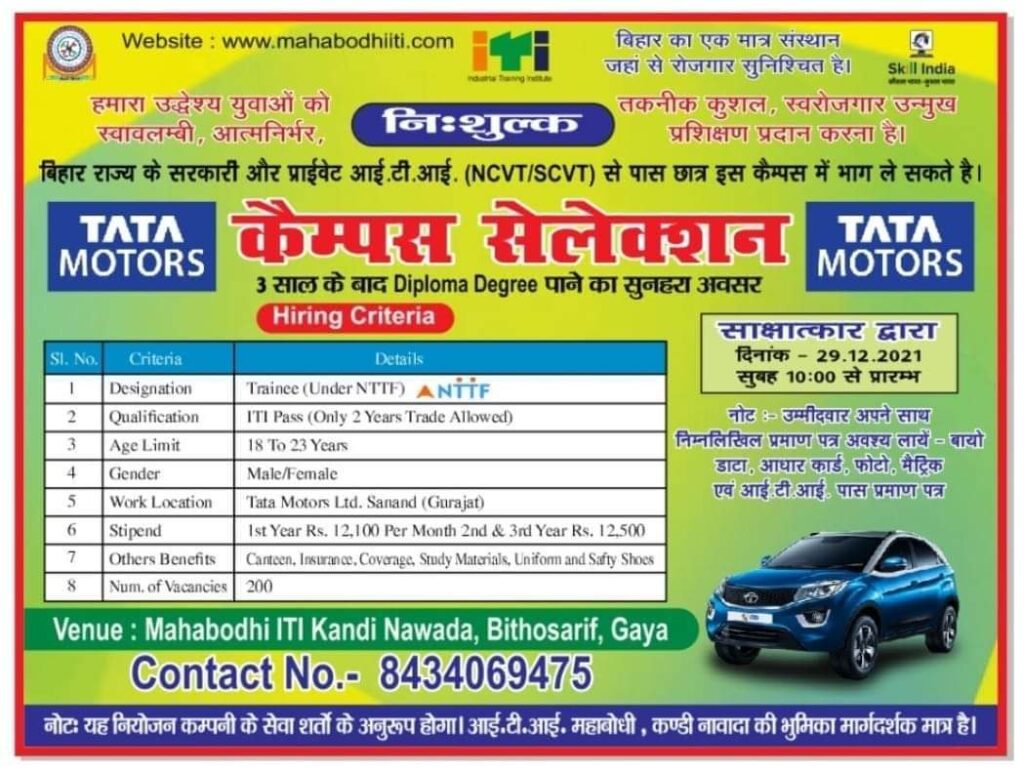 TATA Motors Campus Placement 2021 | 200 Post | Trainee Under NTTF | Male/Female |