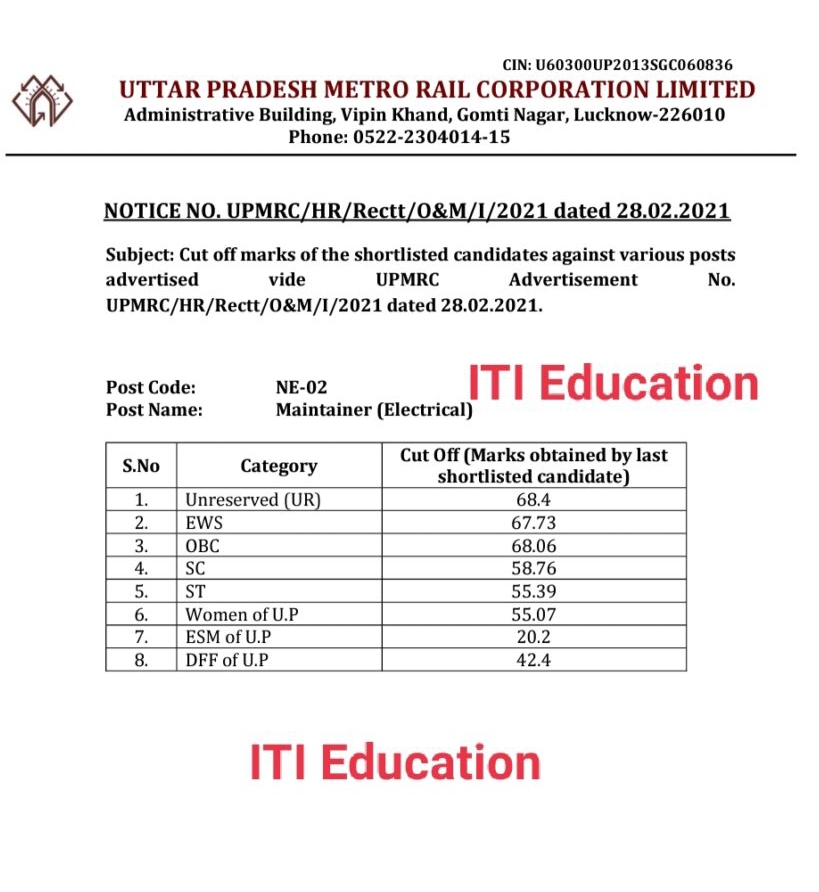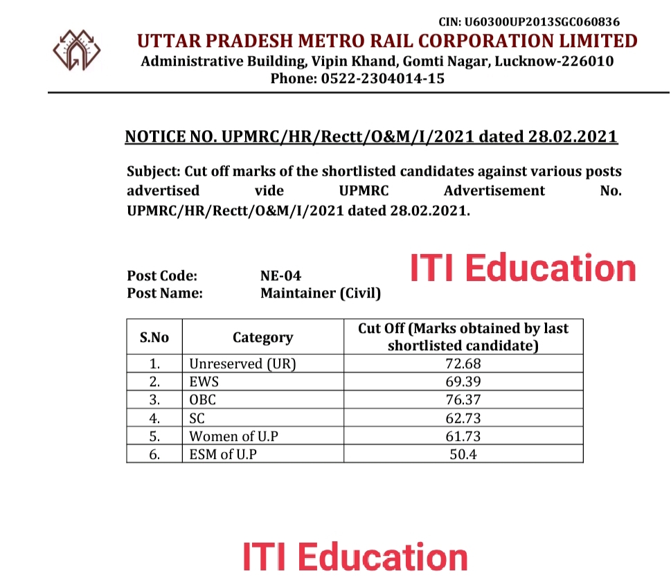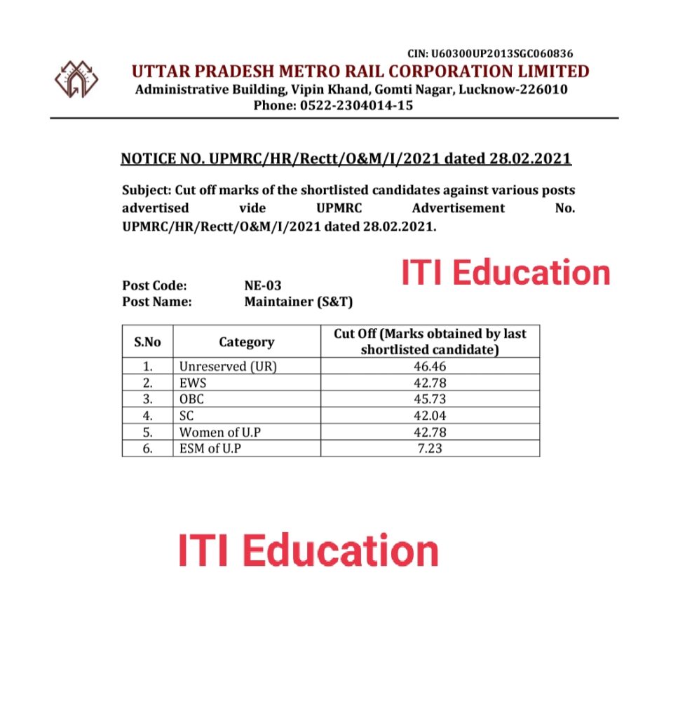 UP Metro ITI Maintainer Cutoff Marks All Trade