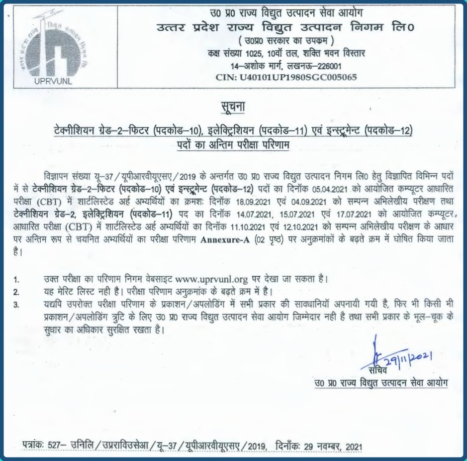 UPRVUNL TG2 Final Result 2021- UPRVUNL की तरफ से आईटीआई विद्यार्थियो के लिए तीन ट्रेड के लिए टेक्नीशियन ग्रेड 2 का बहाली आया था | जिसमे फिटर, इलेक्ट्रीशियन और इंस्ट्रूमेंट के लिए कुल 263 पदों के लिए मार्च 2020 में बहाली आया था | UPRVUNL की तरफ से अच्छी खबर निकल कर आ रहा हैं इलेक्ट्रिशियन, फिटर एवं इंस्ट्रूमेंट ट्रेड का फाइनल रिजल्ट जारी कर दिया गया है | नीचे दिए गए लिंक से आप अपना रिजल्ट डाऊनलोड कर सकतें हैं |