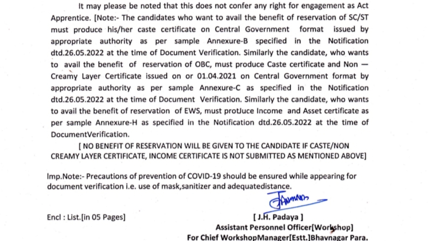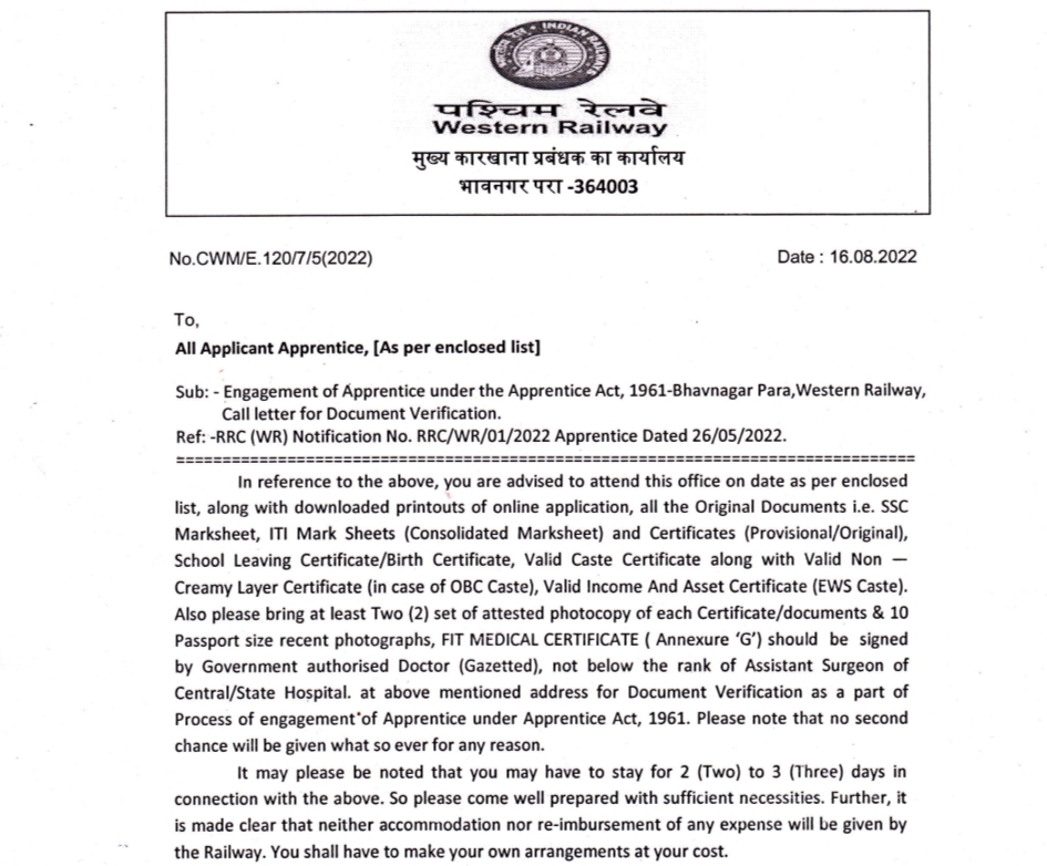 Western Railway Apprentice Bhavnagar Para Result 2022- Western Railway की तरफ से आईटीआई विद्यार्थियों के लिए कुल 3612 पदों पर अप्रेंटिस का फॉर्म मई 2022 में निकाली गई थी | जिसका फॉर्म भरने का अंतिम तिथि दिनांक 27 जून 2022 तक था | Western Railway का अलग अलग यूनिट का Document Verification चल रहा है | Western Railway की तरफ से Document Verification की सूचना Email के माध्यम से दी जा रही है |