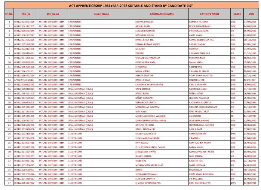 Western Railway Ratlam Division Apprentice Joining Merit List 2022 Download